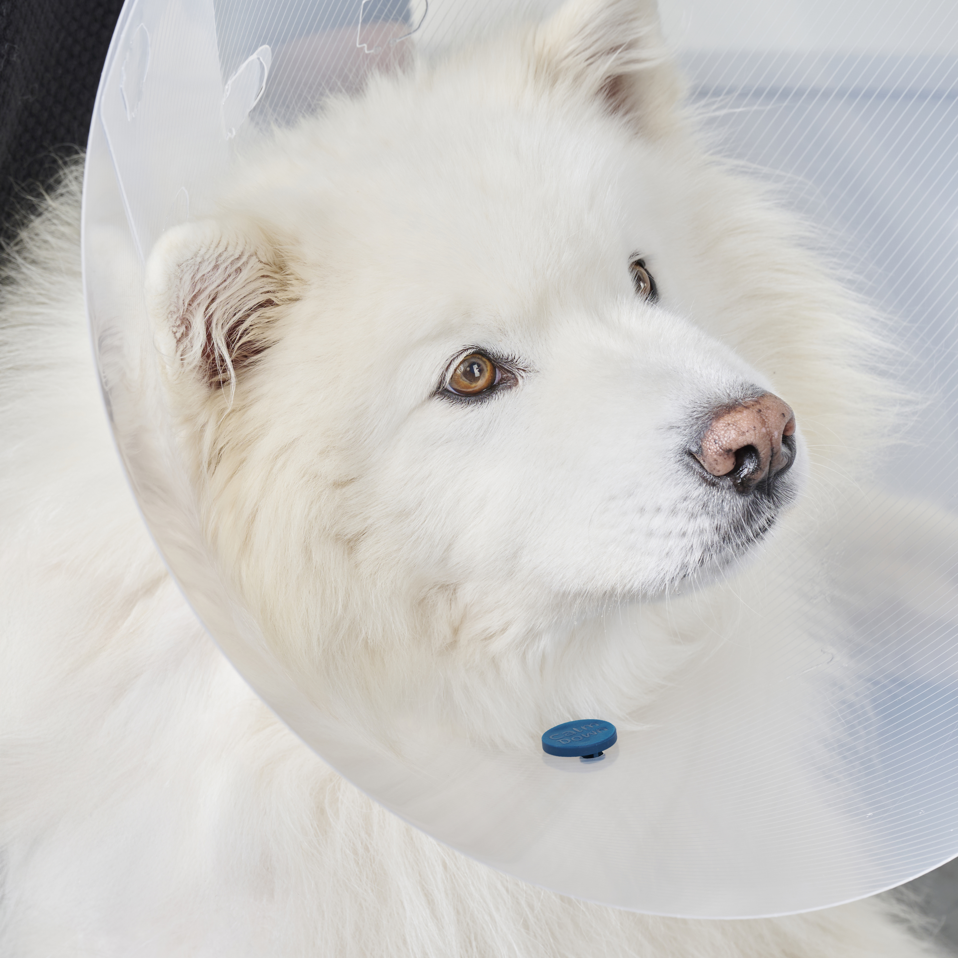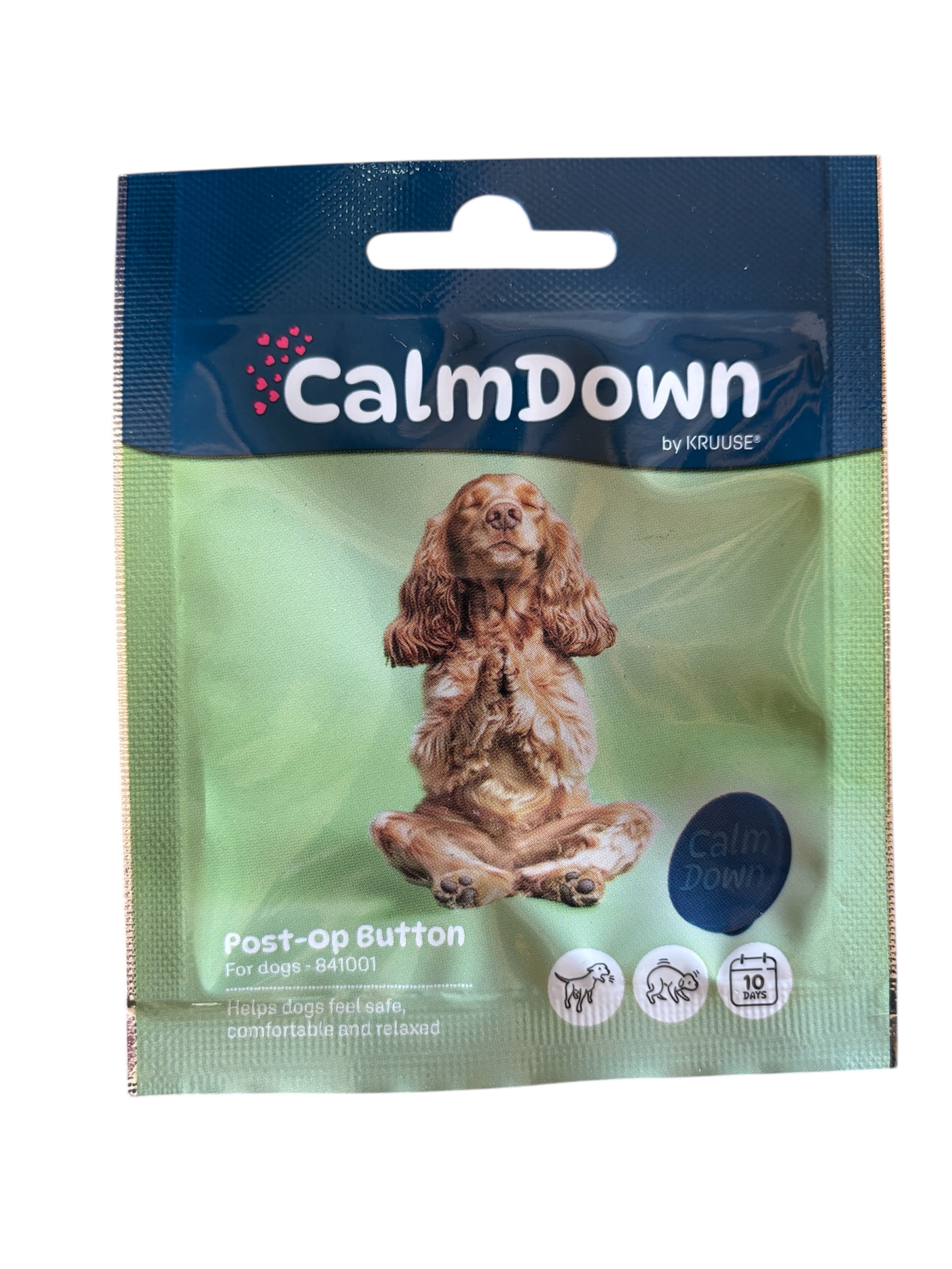 El botón postoperatorio CalmDown® de KRUUSE reconforta a los perros y tiene un efecto calmante porque imita las feromonas naturales que una perra produce para calmar a sus cachorros.